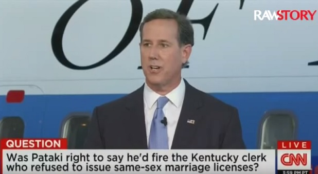 How far has America fallen, and how quickly? Sen. Rick Santorum tried to measure our moral decline at last night’s opening debate—featuring four presidential candidates—by comparing those who cheered Kim Davis’ arrest with another faithful person.