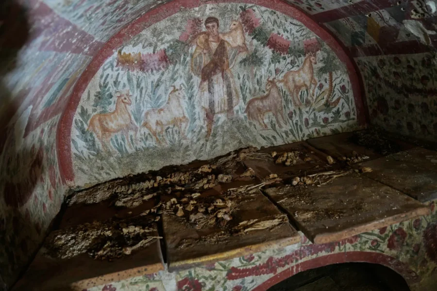 The artwork dates back to the third century, when Christians were still persecuted under Roman rule. It depicts a youthful, clean-shaven Jesus dressed in a toga and carrying a goat on His shoulders, an image known as the “Good Shepherd.”