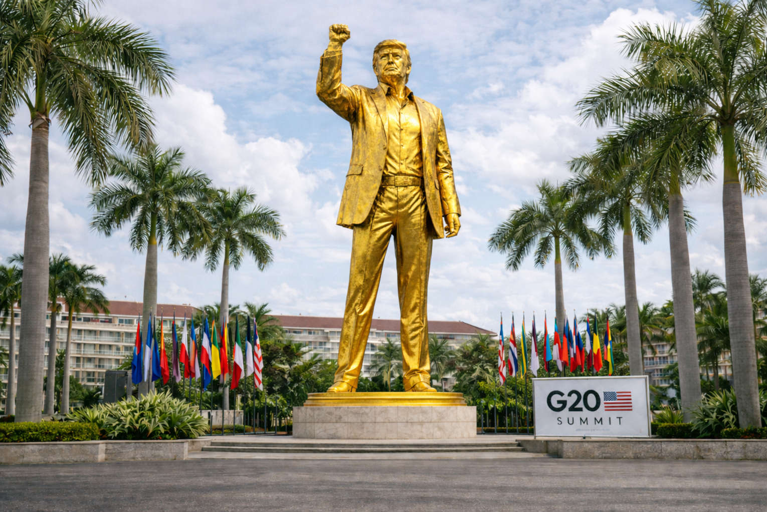 The statue appears loosely based on an image taken after an attempted assassination in Butler, Pennsylvania, showing Trump with his fist raised. While the White House has maintained it is not involved in the crypto project, and says the resort will host the summit “at cost,” the symbolism of a golden monument to a sitting president at an international summit cannot be ignored.