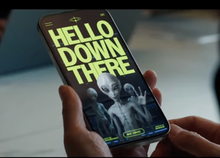 The commercial cuts to a woman in New York City who has been on her cell phone and she looks up and sees a very large UFO hovering over the skyscrapers of New York City. The woman’s face is one of awe and almost reverence.