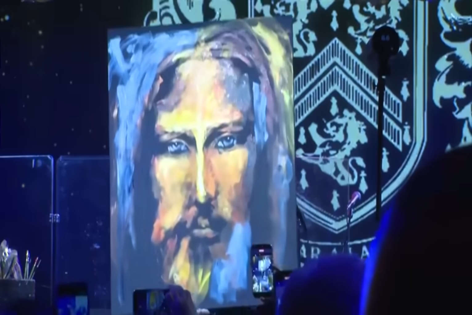 The painting was created on stage in roughly 10 minutes by Christian worship artist Vanessa Horabuena, whose speed-painting performance unfolded as guests watched the image emerge on a black canvas while a slow rendition of “Hallelujah” played.