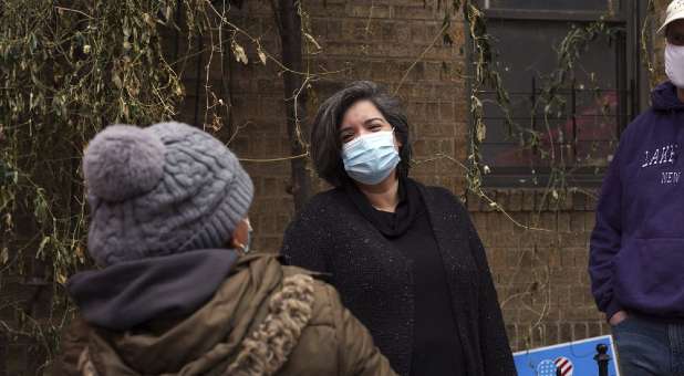 While dozens of New Yorkers lined up outside in the rain, shopping carts at the ready as they waited for free food, Sofia Moncayo led her team in prayer.