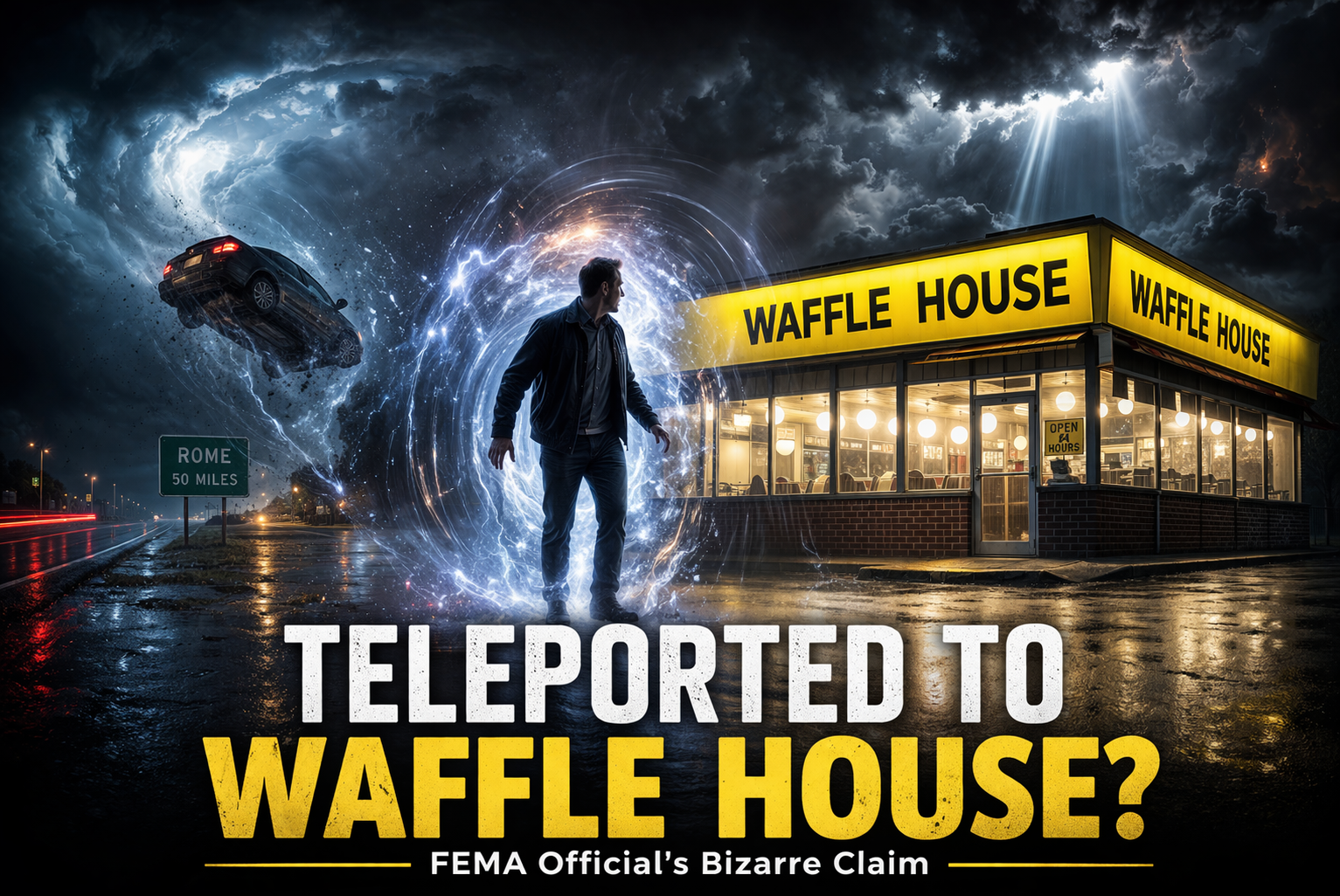 This moment was none other than having his car lifted, all while he was actively driving. He claims he was then teleported 50 miles to a Waffle House in Rome.