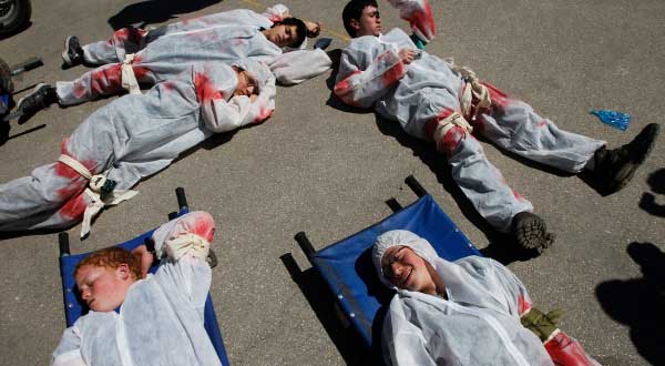 Israeli schoolchildren play the role of mock victims during a drill simulating an attack, organized by the Israeli emergency service organization, Zaka, at a Jewish seminary in Jerusalem on Thursday. A gunman on a motorbike shot dead four people, including three children, at a Jewish school in Toulouse, France, on Monday.
