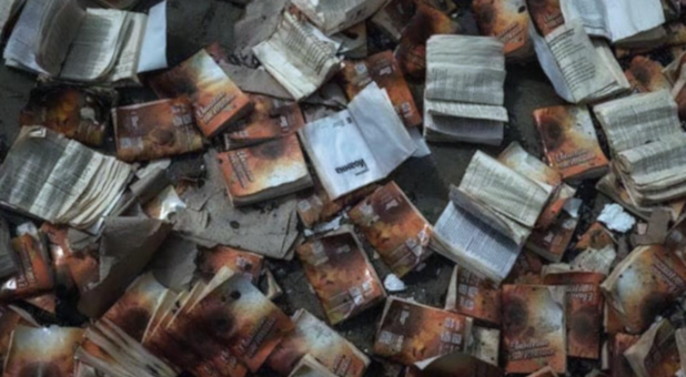 Mission Eurasia’s post also included photos of burned Bibles and books, and the destroyed building.