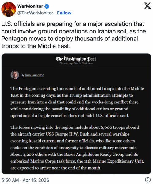 The infusion of firepower appears likely to coalesce with warships already in the Middle East just as the two-week ceasefire is set to expire April 22. The troops will join the estimated 50,000 personnel that the Pentagon has said are involved in operations countering Iran.