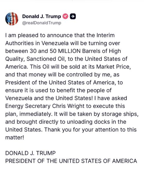 President Donald Trump announced that Venezuela’s interim authorities will turn over between 30 million and 50 million barrels of sanctioned oil to the United States “immediately.” The oil, described as “high-quality” crude previously held in sanctioned stockpiles, will be sold at market prices with the proceeds managed by the U.S. government to benefit both American and Venezuelan people, Trump said.