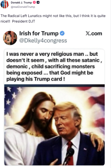 The image itself is of Jesus with His arms around Trump, and the caption reads, “I was never a very religious man… but doesn’t it seem with all these satanic, demonic, child-sacrificing monsters being exposed…that God might be playing his Trump card!”