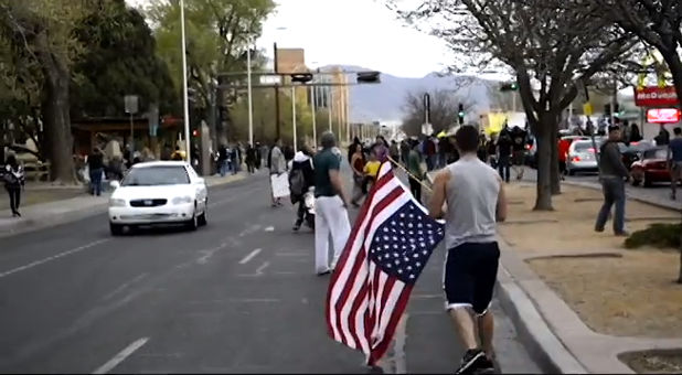 A video depicting a Marine and soldier taking an American flag from two protesters in Albuquerque, N.M., has gone viral.